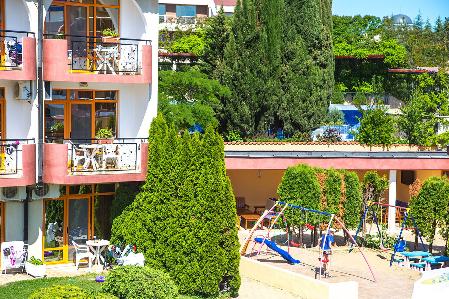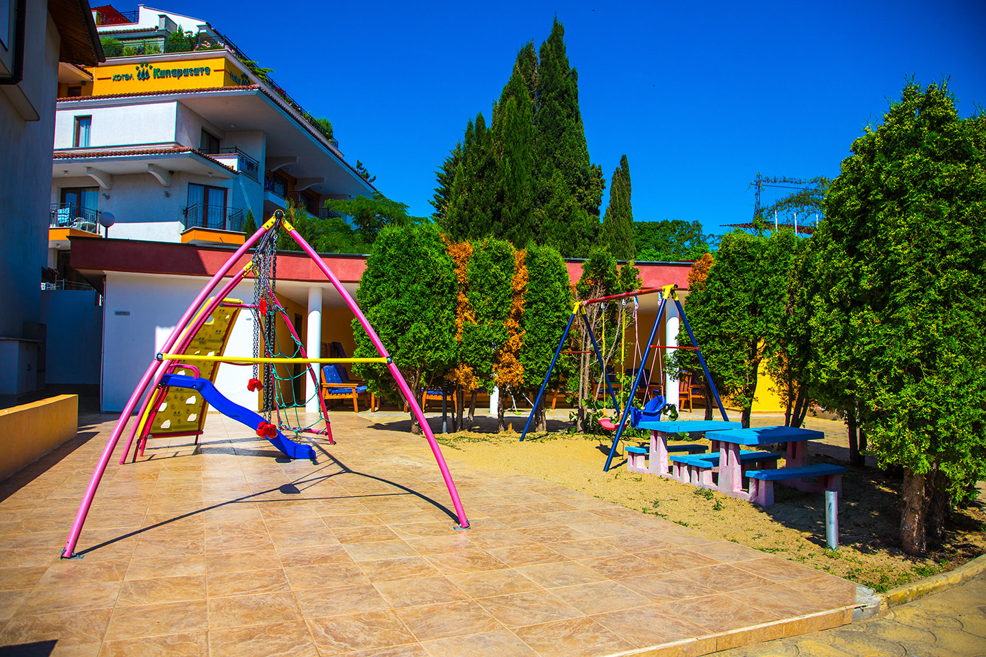 Детската площадка е разположена така, че да се вижда спокойно от басейна и от част от местата в заведенията. Можете да се наслаждавате на почивката си, да плувате или да се поглезите с нещо вкусно, докато децата си играят.