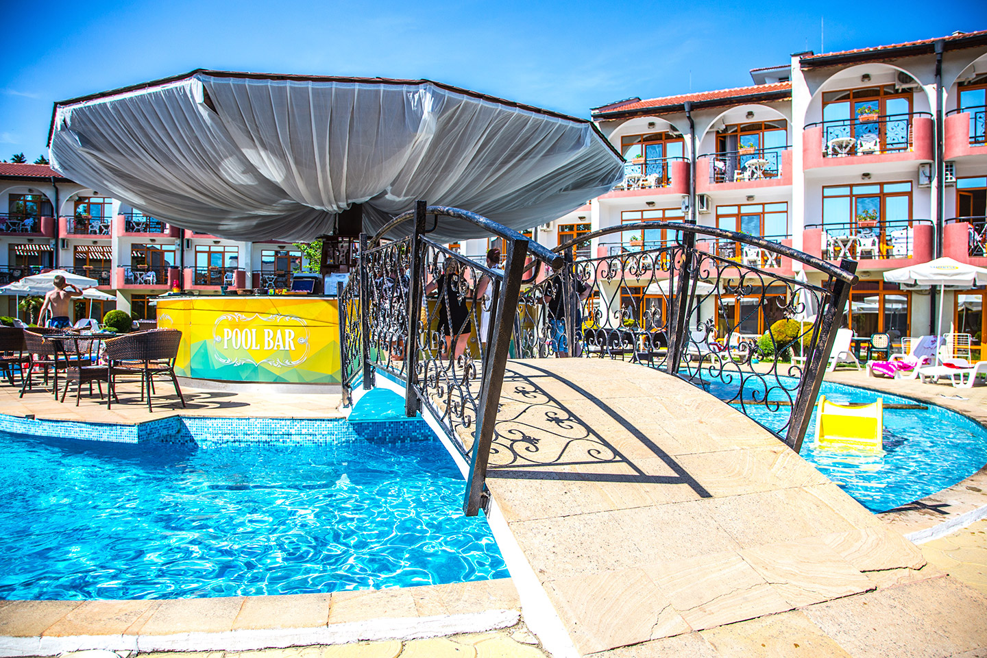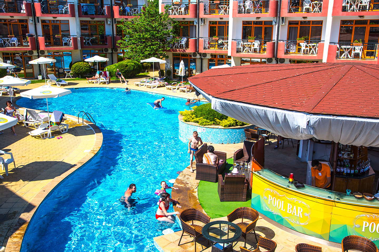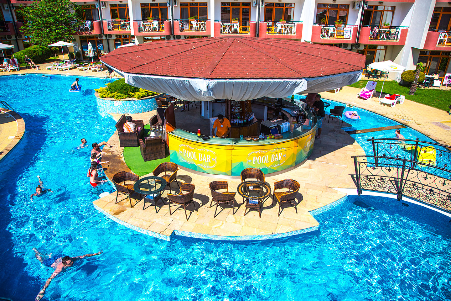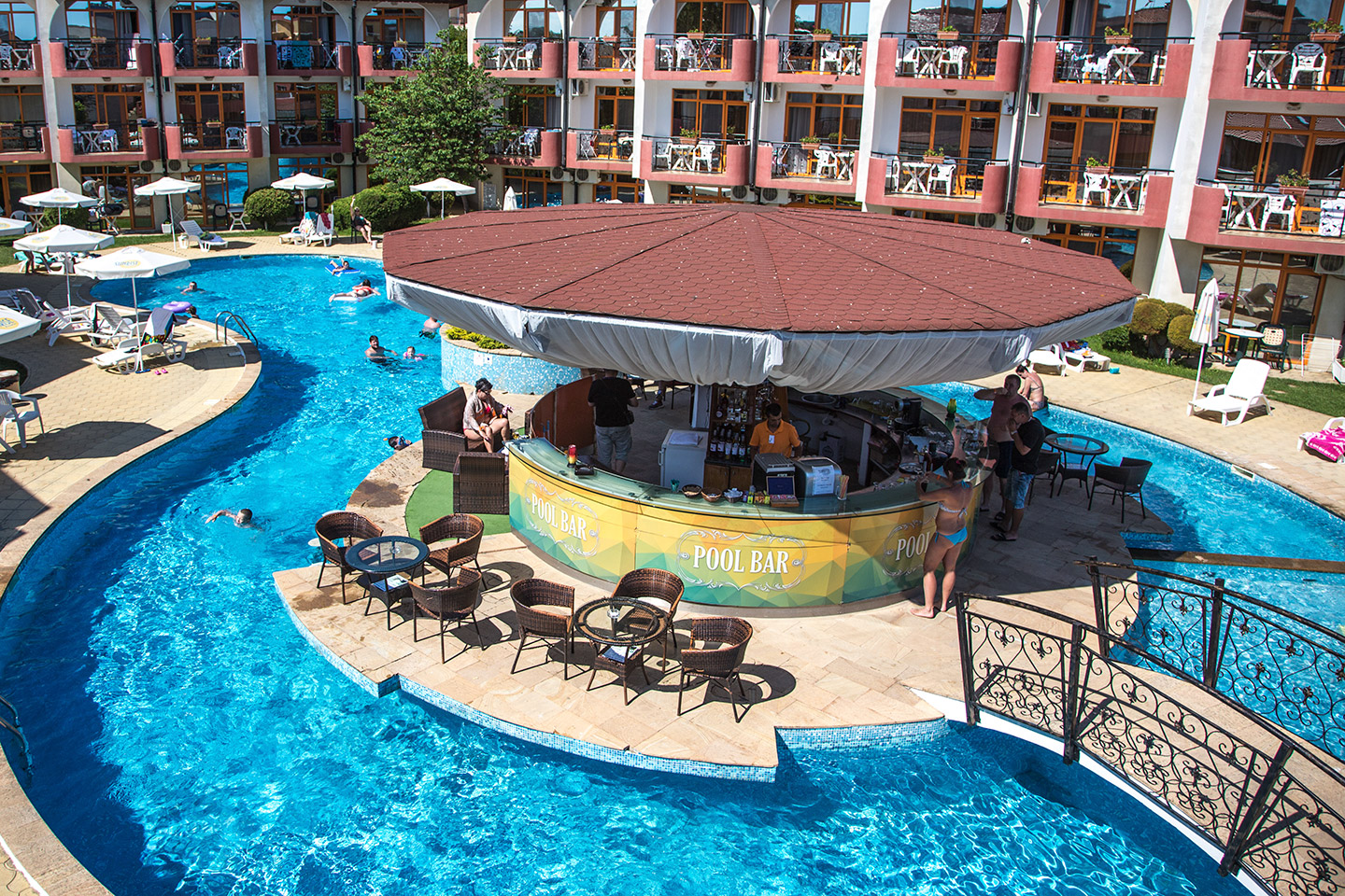 Зеленина, музика, прохладата на водата и на любимата ви напитка и усмихнати бармани, които се грижат за доброто ви настроение - Sunrise пул бар е обичано място от всички гости на хотела.